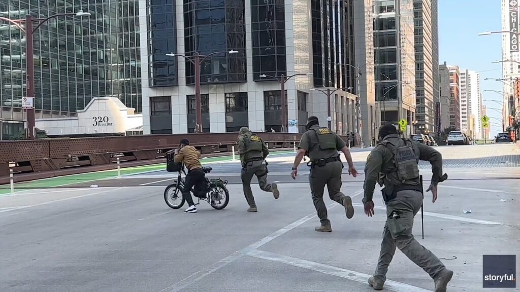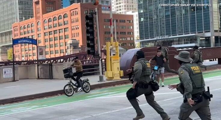 Footage of the chase in the 300-block of North Dearborn Street in the Loop was captured by Christopher Sweat, who said that agents chased after the cyclist after he “made verbal comments but no physical or threatening contact.”