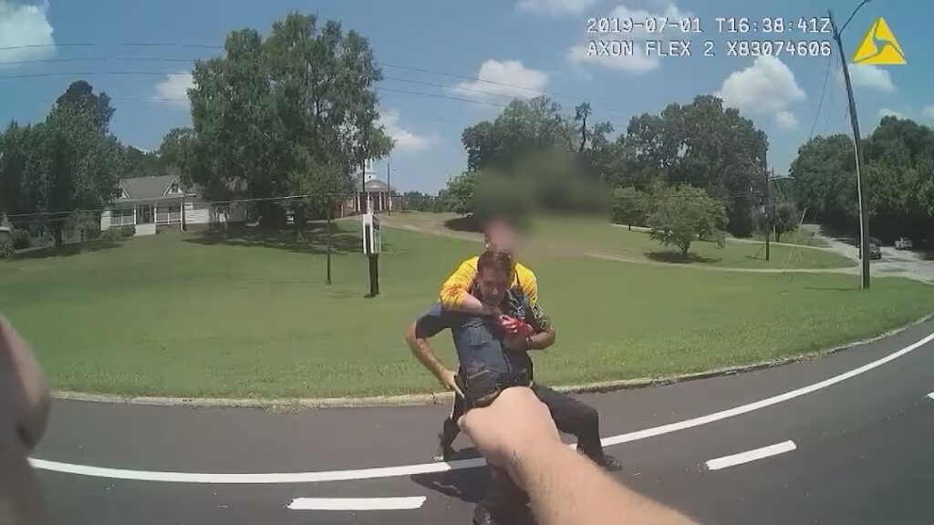The footage shows Hong getting back up. Both officers tell him to get on the ground, but he doesn’t and is seen charging at the first officer again.