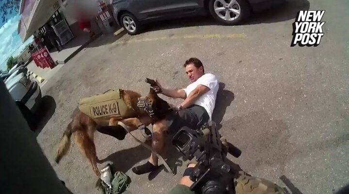 The Tucson Police department released body cam footage Tuesday of Francisco Javier Galarza aiming a semi-automatic at a K9 named Kiro, as the dog brought the runaway suspect to the ground.